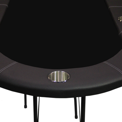 Oval-shaped poker table for 10 players comes with metal folding legs. Also included are 10 stainless steel cup holders jumbo size (3-1/2). Supreme cloth felt and removable arm rest to change your cloth.